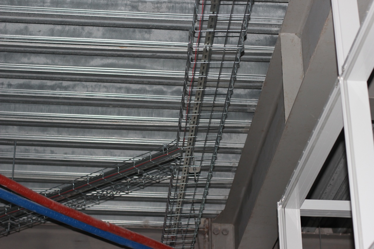 В ходе выполнении работ по электромонтажу были проложены кабеленесущие системы от электрощитовой торгово-офисного центра на основе перфорированных лотков ДКС для межэтажной прокладке распределительных кабелей и на основе проволочных лотков ДКС для этажной прокладке. Этажные и распределительные шкафы выполнены на основе модульных щитков Ram base и применено модульное оборудование Legrand. Для целей освещения торговых и офисных помещений били применение светодиодные светильники и люминисцентные светильники на основе более совершенных люминисцентных ламп с индексом цветопередачи до Ra 85.